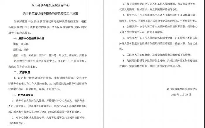根据医院疫情防控《实施方案》和《工作方案》,制定康养中心应急预案,以切断一切感染途径为原则,实行封闭式管理,全力保护好康养中心老人和工作人员的安全。